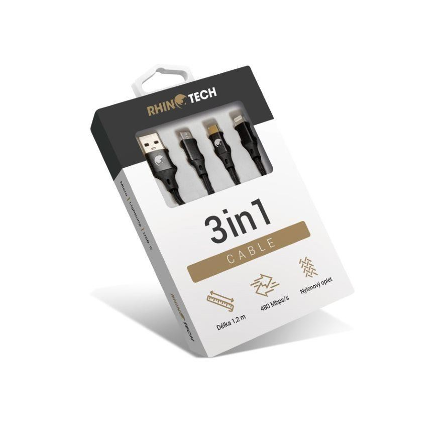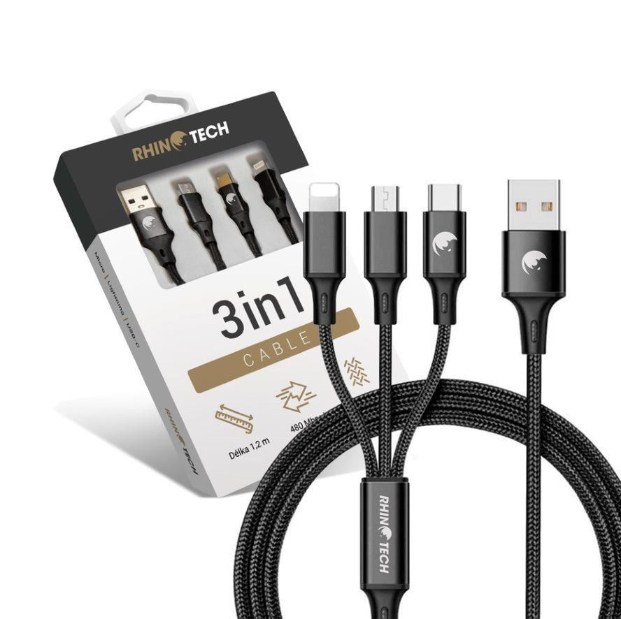 RhinoTech nabíjecí a datový kabel 3v1 USB-A (MicroUSB + Lightning + USB-C) 1,2m černá