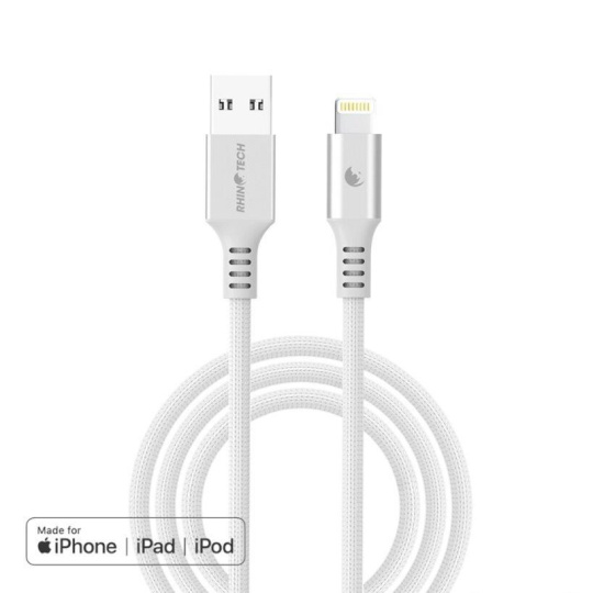 Kvalitní RhinoTech datový a nabíjecí MFi kabel z odolného nylonového materiálu s konektory USB-A na Lightning o délce 1,2m v elegantní stříbrné barvě.