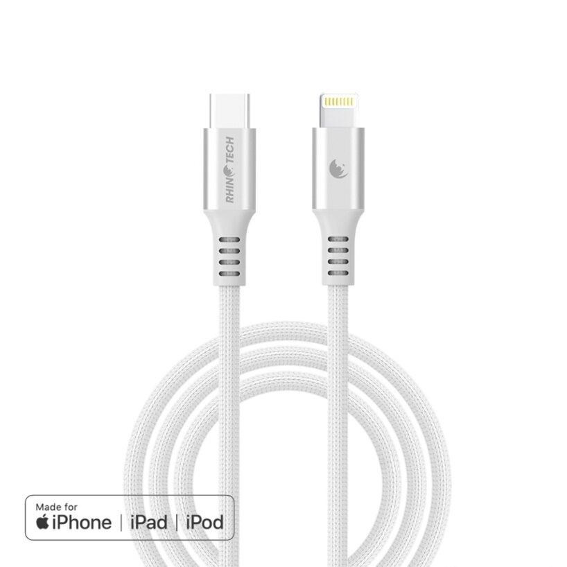 Kvalitní RhinoTech datový a nabíjecí MFi kabel z odolného nylonového materiálu s konektory USB-C na Lightning o délce 1,2m v elegantní stříbrné barvě.