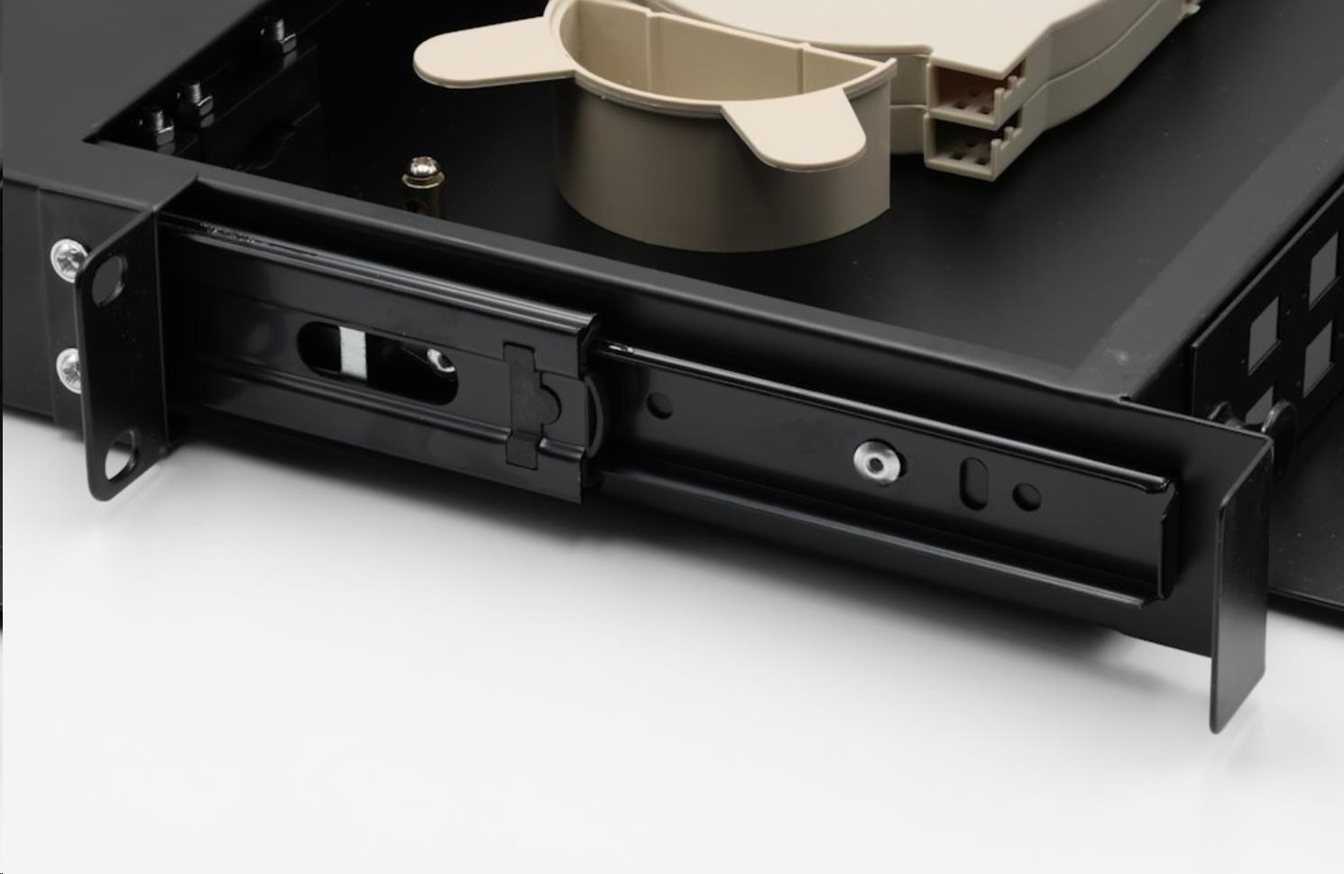 19" rozvádzač, výška 1U, pre 24 simplex adaptérů SC alebo duplexných LC, farba čierna, kovová skrinka, kazeta na zvarky. Van sa vysúva pomocou posuvných koľajníc.