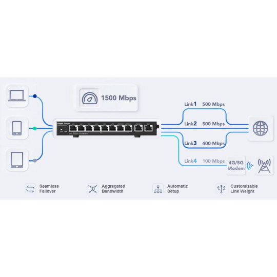 Popis produktu Ruijie RG-EG310GH-P-E je kabelový Gigabitový router s PoE, dostatečným VPN výkonem pro obsloužení poboček a vzdáleně pracujících pracovníků v rámci firmy. Bezpečný a spolehlivý router s vlastním webovým managementem, možností správy přes Ruijie Cloud odkudkoliv, blokování obsahu podle typu aplikace, inteligentní Multi-WAN load balancing s možností využít až 4 WAN porty zároveň. Router nabízí 1 Gigabitovými WAN port, 6x Gigabit LAN, 3 Gigabitový LAN/WAN porty, celkový výkon v NATu 1.5 Gbps a 802.3af/at PoE na prvních 8 portech s celkovým PoE budgetem 130W. Router pro přístup do lokální sítě umožňuje i několik možností VPN serverů a to konkrétně: IPsec, PPTP, L2TP a OpenVPN. Limity VPN • IPsec: 230 Mbps, max. 64 tunelů • L2TP: 640 Mbps, max. 64 tunelů • OpenVPN: 100 Mbps, max. 64 tunelů Obsah balení • Zařízení • Napájecí adaptér 52V / 2.4A • Napájecí kabel Technické parametry Konektory a rozhraní Rychlosti WAN:(1) 10/100/1000Mbps Možnost více WAN:Ano Rychlost LAN:(6) 10/100/1000Mbps + (3) 10/100/1000Mbps LAN/WAN Gigabit LAN:Ano Napájení Typ napájení:DC konektor Typy PoE:PoE-Out (pouze) Podporované PoE-Out standardy:802.3af, 802.3at Počet PoE Out portů:8 PoE budget [W]:110 Max. spotřeba energie [W]:130 Napájení přes konektor/svorkovnici:54V / 2,4A Fyzické charakteristiky Provedení:Desktop Ventilátory:Bez ventilátoru Šasi:Kovové Tlačítka:Reset Provozní teplota [°C]:0 až 40 Šířka [mm]:202 Výška [mm]:28 Hloubka [mm]:108 Hardware Frekvence CPU [MHz]:1350 Počet CPU jader:2 Obecné Propustnost NAT [Mb/s]:1500 Propustnost VPN IPsec VPN [Mb/s]:230 Software Podporované VPN:PPTP, L2TP, IPSec, OpenVPN Web management:Ano Management:Webové rozhraní, Ruijie cloud Podpora IPv6:Ano Výchozí IP adresa:192.168.110.1 Výchozí jméno a heslo:Nastavuje se při prvním spuštění.