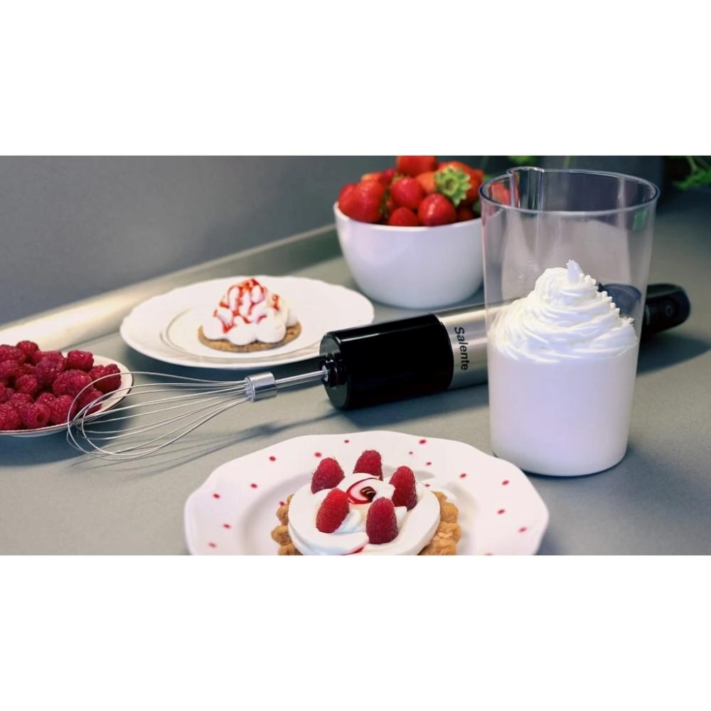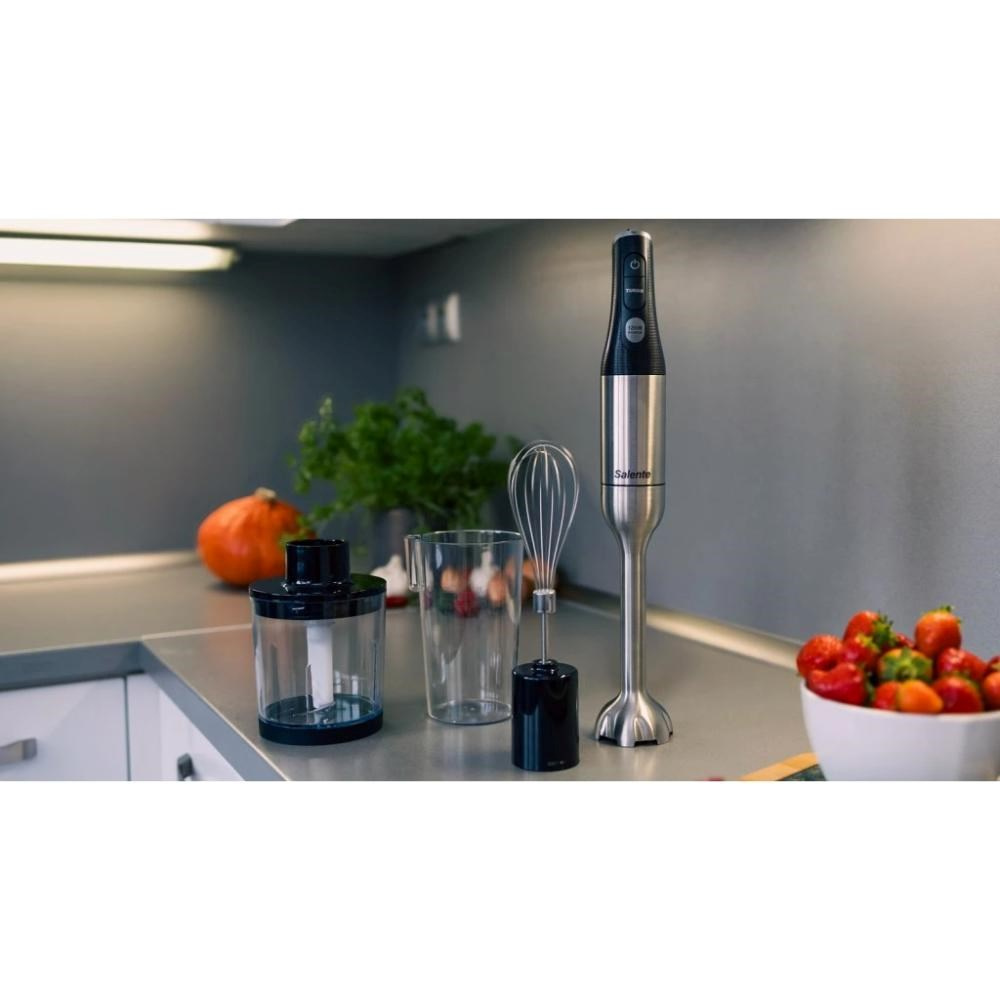 Salente Mixxo prichádza do vašej kuchyne aj s bohatým príslušenstvom: môžete využívať šľahaciu nadstavec s nerezovou metličkou, mixovaciu nádobu o objeme 600 ml (s odmerkami po 100 ml) a tiež sekáč s objemom 500 ml, ktorý je vybavený nerezovými sekacími nožmi a silikónovou protišmyšľovou podložkou. Zakúpením tohto všestranného mixéru jednoducho získate kompletné vybavenie, ktoré posunie vaše kulinárske čarovanie o úroveň vyššie.