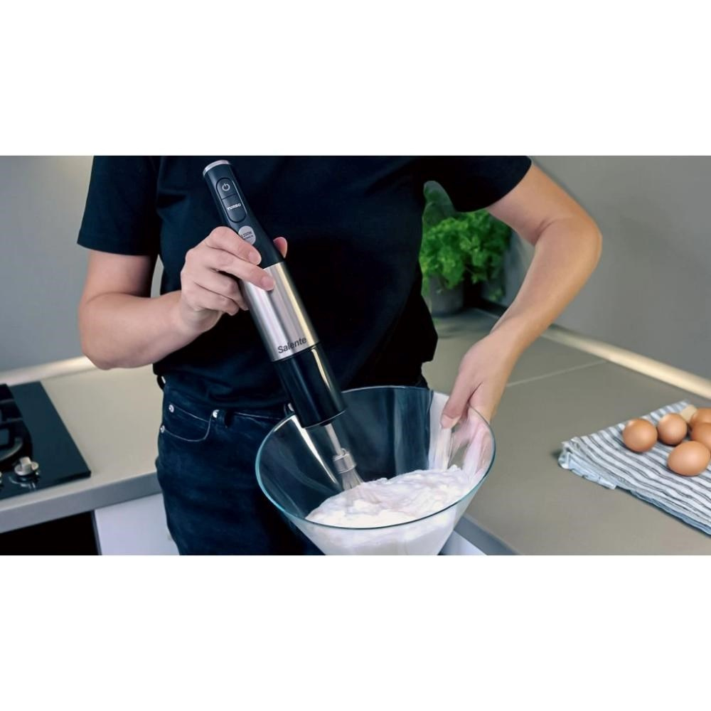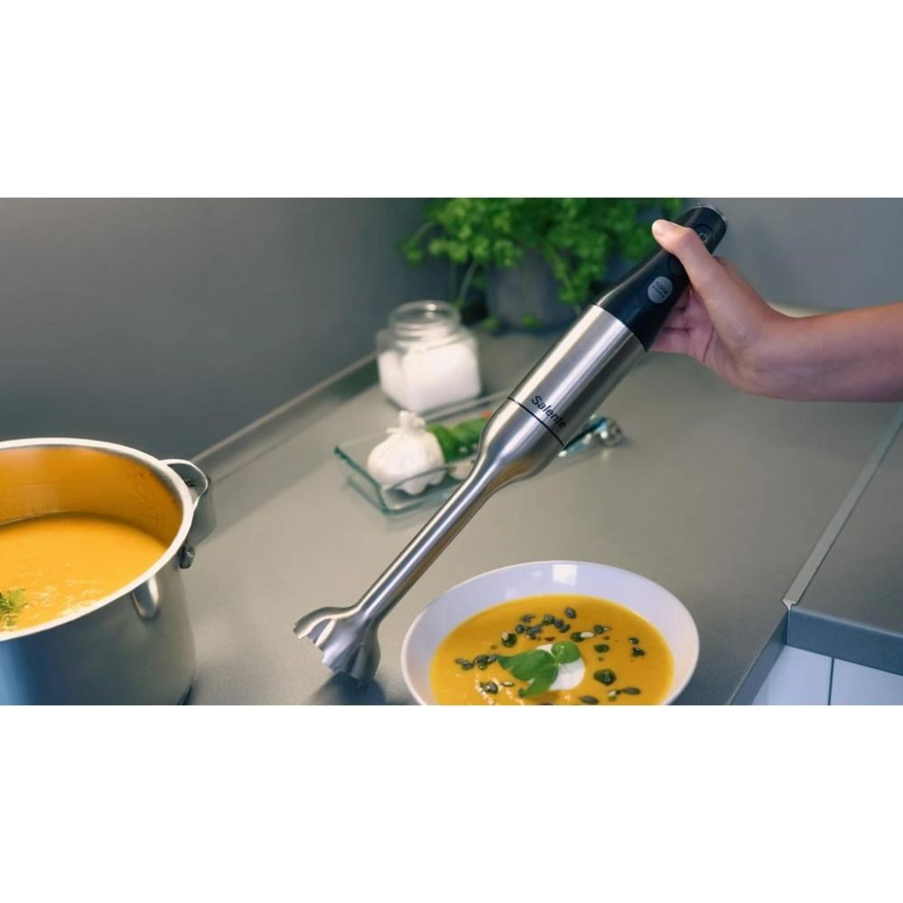 Predstavte si, že pri varení máte po ruke mága, ktorý dokáže na povel premeniť vašu kuchyňu na profesionálne kulinárske štúdio. Tu je. Volá sa Salente Mixxo a ide o multifunkčný tyčový mixér s 1200W motorom, ktorý hravo zvládne hneď tri kľúčové funkcie. Rozmieša vám suroviny na všetko od jemných polievok cez smoothie až po omáčky. Dokáže vyšlehať načechrané krémy, cesta aj napríklad vaječné bielky. A poradí si aj so sekaniem mäsa, tvrdého pečiva alebo dokonca orechov.