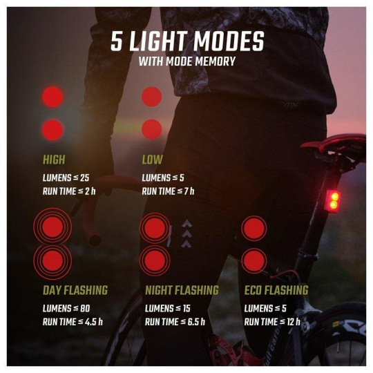 S Buster RL 80 máte na výber z piatich svetelných režimov, pomocou ktorých môžete individuálne nastaviť intenzitu osvetlenia a dobu výdrže batérie. V režime High dosahuje svetlo Buster RL 80 svetelný výkon 25 lumenov po dobu až 2 hodiny, v režime Low svieti až 7 hodín pri svietivosti 5 lumenov. Režim Day Flash dokáže pomocou dvoch červených blikajúcich LED upozorňovať na cyklistu po dobu 4,5 hodiny so svetelným výkonom 80 lumenov. V režime Night Flashing bliká zadné svetlo až 6,5 hodiny pri svetelnom výkone 15 lumenov. Ak jazda trvá dlhšie, dokáže zabezpečiť viditeľnosť v cestnej premávke režim Eco Flash až do 12 hodín.