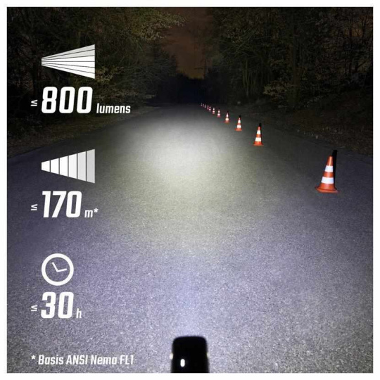 - 5 svetelných režimov: High (800 lm), Mid (400 lm), Low (150 lm), Night Flashing (600/200 lm), Day Flashing (200 lm)