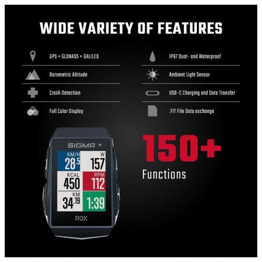 Nezáleží na tom, či sú pre vás dôležité super výkony alebo len udržiavať fyzičku či zdieľať svoje aktivity s priateľmi a rodinou. ROX 11.1 EVO s viac ako 150 funkciami sa stáva používateľom tréningovým parťákom pre tréningy vonku aj na trenažéri. Okrem početných tréningových funkcií ponúka aj navigáciu, štruktúrované workouty a pripojenie k externým sensorom. Môžete sa tak plne sústrediť iba na svoj výkon, zvyšok zariadi ROX 11.1 EVO. Vďaka funkcii LIVE SCREEN môžete svoje dáta sledovať a analyzovať kedykoľvek pomocou aplikácie SIGMA RIDE. S navigáciou GPS a mnohými ďalšími funkciami posunie váš tréning na najvyššiu možnú úroveň. Prvotriedna integrovaná funkcia pre vašu bezpečnosť CRASH ALERT odošle správu vašim núdzovým kontaktom v prípade pádu. Chytré oznámenia Smart Notifications počas jazdy informujú o prichádzajúcich hovoroch a SMS.