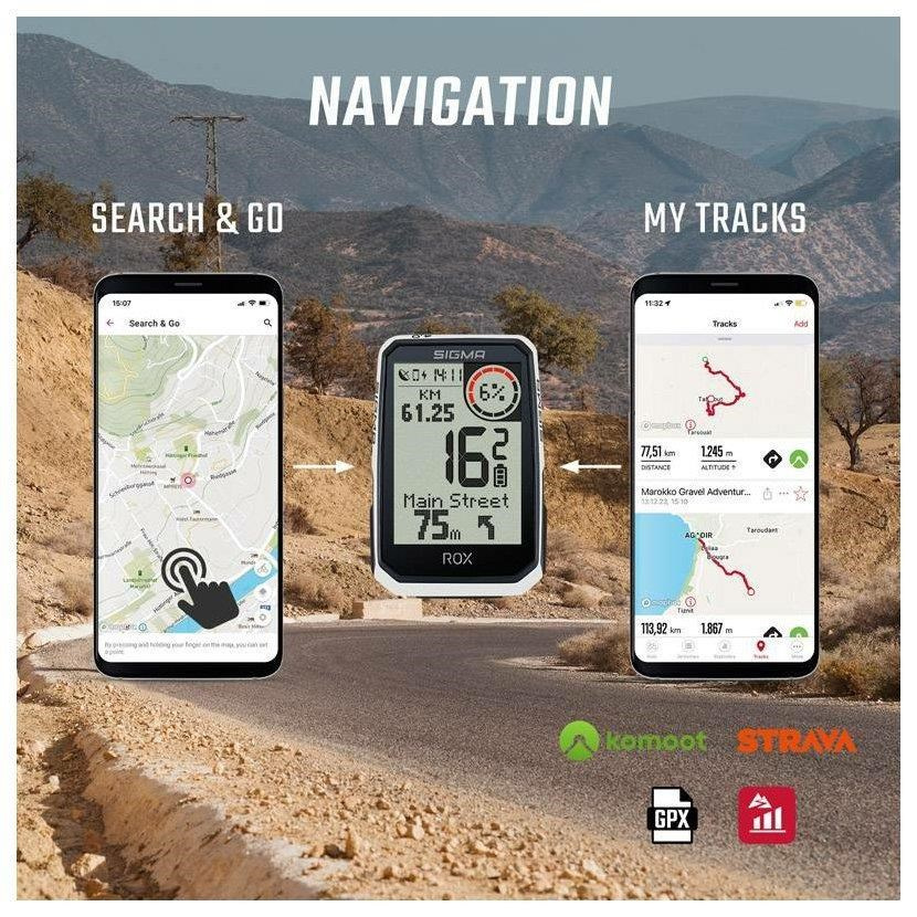 Počas navigácie sa na displeji ROX 4.0 Endurance zobrazuje trasa a pokyny na odbočku "Turn-by-Turn". Odbočková šípka a akustický signál ukazujú ďalšiu odbočku. Aby ste odbočku nezmeškali, zariadenie ROX v spolupráci s aplikáciou SIGMA RIDE rýchlo naplánuje novú trasu do cieľa s aktuálnym výškovým profilom.