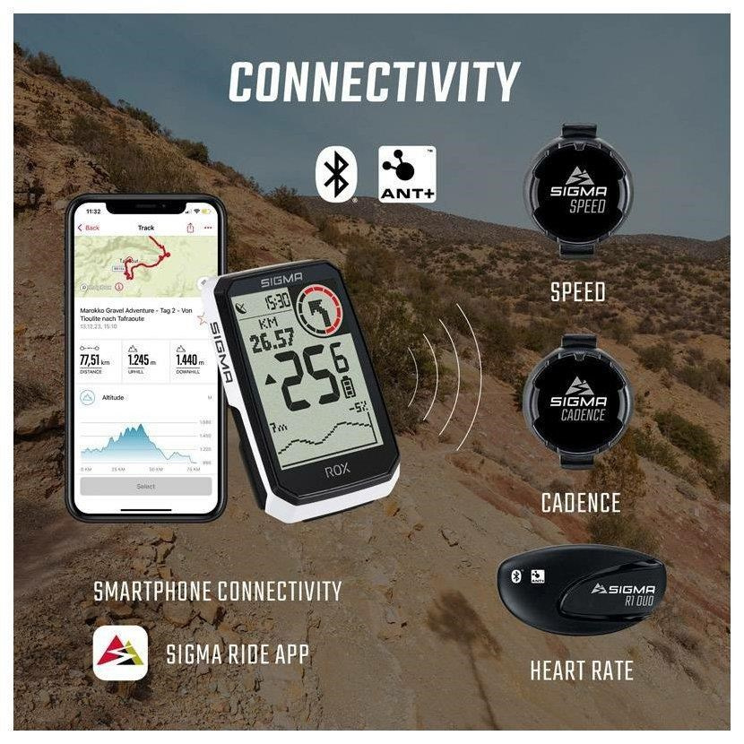 výškový profil, rýchlosť, vzdialenosť a tréningový čas. Navigačné pokyny a pripojenie k e-biku a externým čidlám nie sú pre cyklopočítač ROX 4.0 Endurance žiadny problém! Vďaka bezplatnej aplikácii SIGMA RIDE je možné aktuálne dáta jazdy