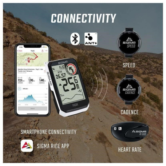 výškový profil, rychlost, vzdálenost a tréninkový čas. Navigační pokyny a pripojení k e-biku a externím čidlům nejsou pro cyklopočítač ROX 4.0 Endurance žádný problém! Díky bezplatné aplikaci SIGMA RIDE lze aktuální data jízdy