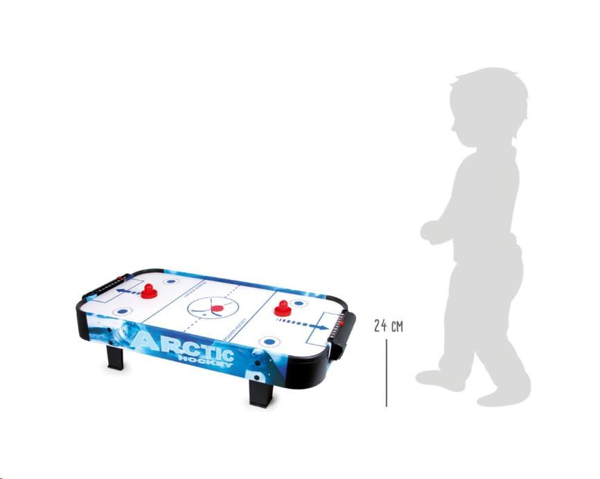 Populárny vzdušný hokej preverí pohľad a rýchlosť detí. Vďaka vzduchu vháňanému zospodu zabudovaným ventilátorom môže puk hladko, ale hlavne bleskurychle kĺzať po hernej ploche. Hráči majú k dispozícii kuželové palice, ktorými sa snažia vsrieť puk do súperaovej bránky. Palice sú na spodnej strane opatrené filcom pre jednoduchý a tichý pohyb. Bránka každého z hráčov je vybavená jednoduchým číselníkom na zaznamenávanie priebehu zápasu. Hru možno vďaka jej veľkosti ľahko odložiť, prenášať, alebo aj vziať na cesty. Napájanie je zabezpečené adaptérom so štandardnou európskou zástrčkou na 220–240 V. Výrobok vyžaduje montáž, dodávaný s obrázkovým návodom na zostavenie.