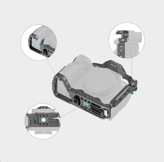 Otvor na bočných stranách a na dne klietky umožňuje upevnenie takéhoto príslušenstva, ako je rukoväť SmallRig na ruku 2456.