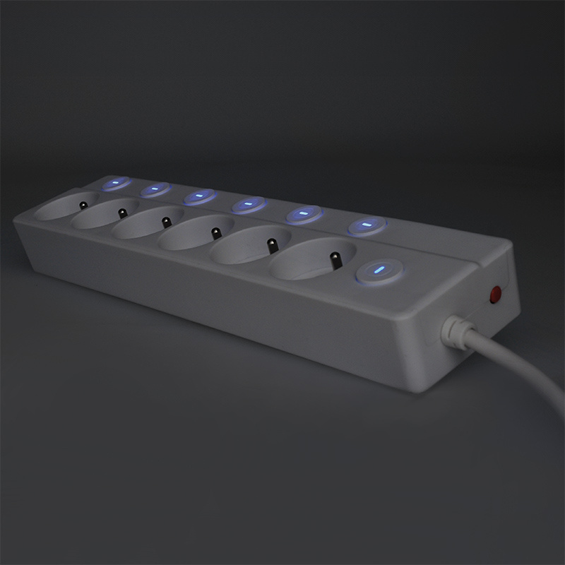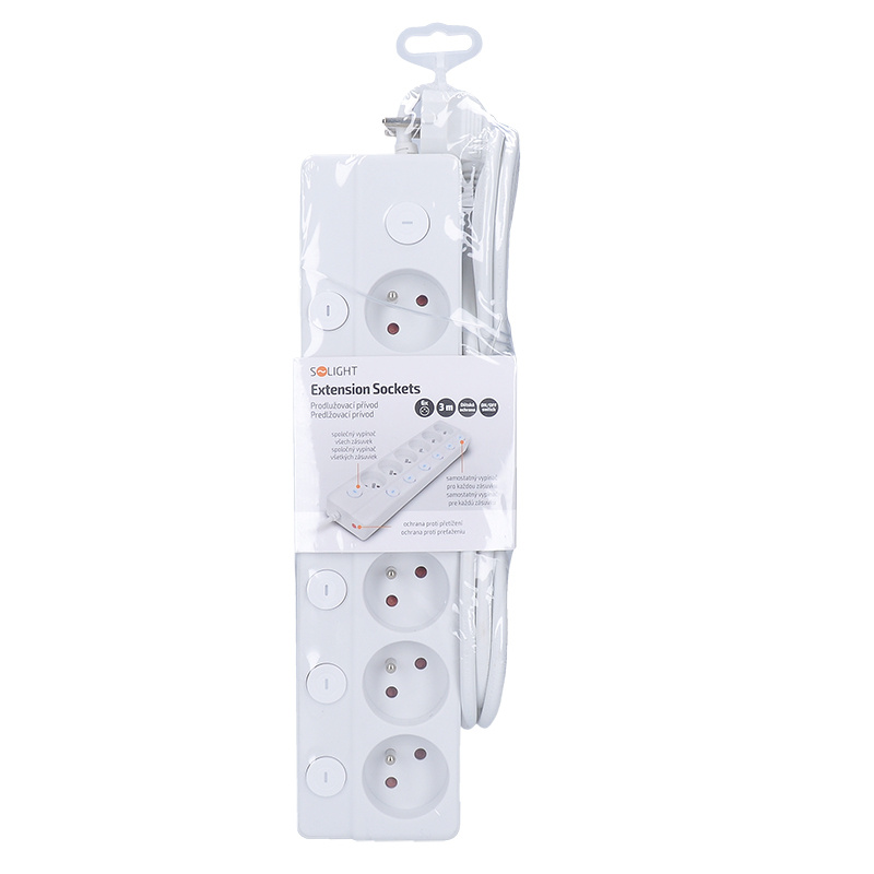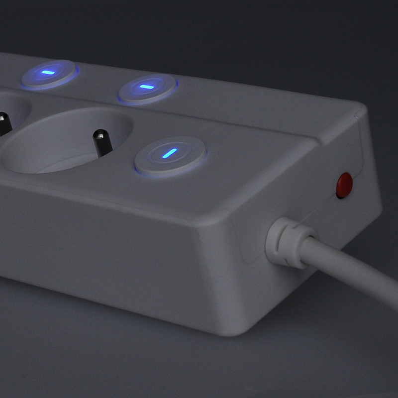 - Prolongačný prívod s samostatnými vypínačmi pre každú zásuvku. Plus centrálny vypínač ovláda všetky zásuvky naraz. Resetovateľný istič pri preťažení zásuvkového poľa prerušuje napájanie. Potom je možné prolongačný prívod opäť uviesť do prevádzky.