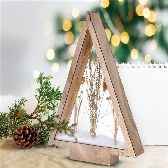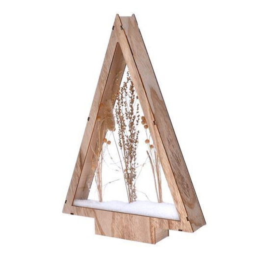 Prírodná vianočná drevená dekorácia vo tvaru vianočného stromčeka so zasneženými zimnými kvetmi, podsvietená tenkým LED reťazcom