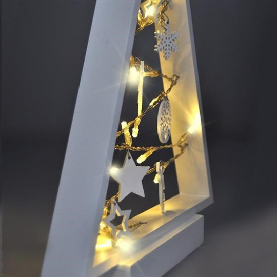 .Solight LED dřevěný vánoční stromek s ozdobami, 15LED, přírodní dřevo, 37cm, 2x AA
