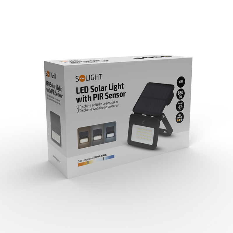 .Solight LED solární reflektor se senzorem, 6W, 660lm, 3CCT, Li-Ion, černá
