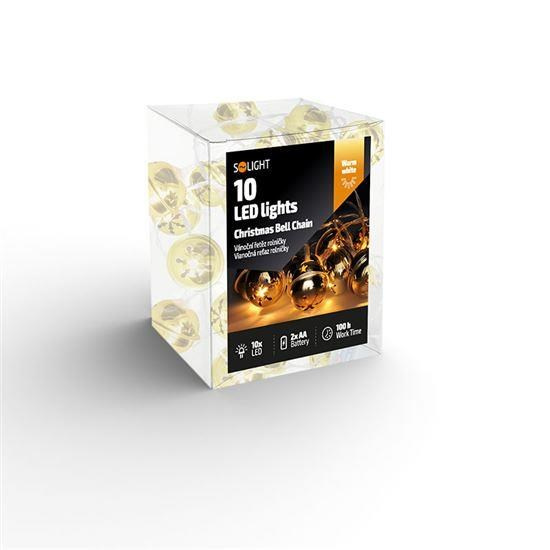 .Solight LED vánoční řetěz rolničky, 10x LED, zlatá, 1,5m, 2x AA