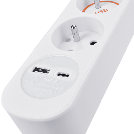 Okrem klasických zásuviek ponúka prívod aj zabudovaný USB adaptér s USB-A a USB-C portmi, s celkovým výkonom až 12 W. Jednoducho tak nabijete telefón, tablet alebo iné zariadenia bez nutnosti hľadať ďalšiu nabíjačku. Veľké podsvietené vypínač umožňuje rýchle odpojenie všetkých pripojených zariadení jedným stlačením.