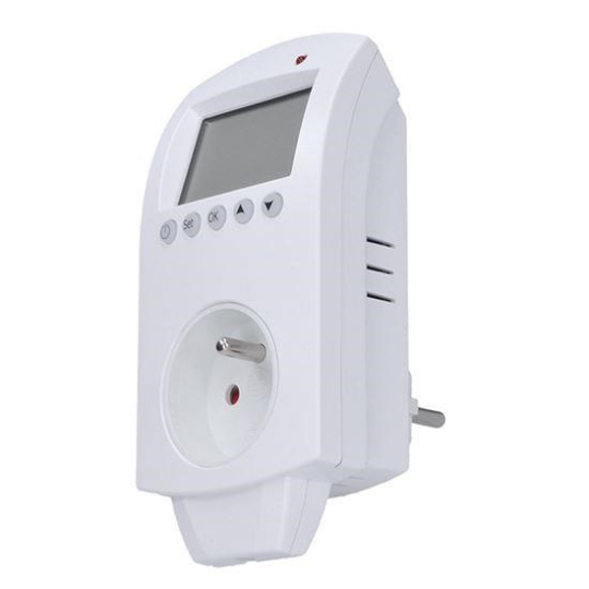 termospínaná programovateľná zásuvka na vnútorné použitie, spína pri dosiahnutí nastavenej teploty možnosť nastavenia rôznych režimov pre vykurovanie alebo chladenie (až 6 režimov na 24h) možnosť nastavenia pre všedný deň a víkend časový spínač, umožňuje zásuvku zapnúť alebo vypnúť automatický režim/režim ručného nastavenia presnosť merania teploty ±1°C rozsah nastavenia teploty 5°C až 35°C vlastná spotreba 0,3W krytí IP20 napájanie: 230V/50Hz, max. záťaž 16A, 3680W