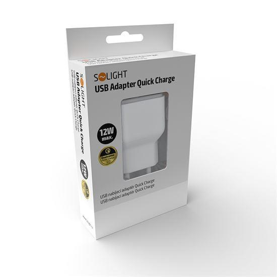 .Solight USB nabíjecí adaptér, fast charge: 1x USB Qualcomm, 5V2A/9V1.5A/12V1A, AC 230V, bílošedý