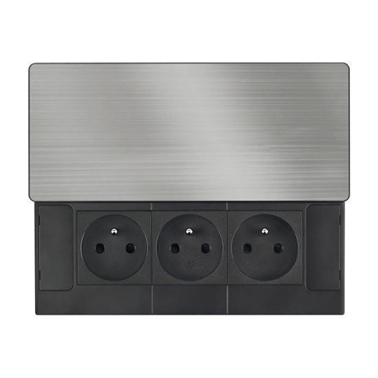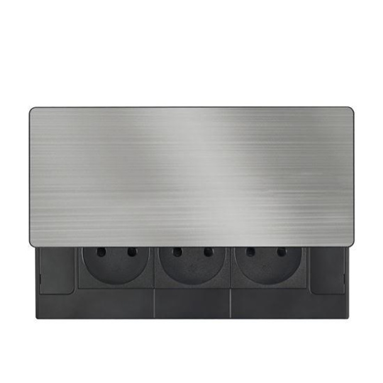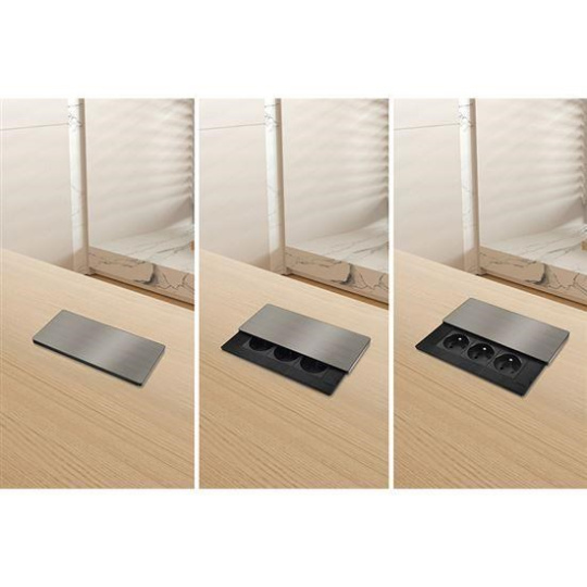 Horný kryt z matnej tmavej nerezovej ocele (inox) pôsobí elegantne a ľahko sa začlení do akéhokoľvek moderného interiéru. Nízky profil a posuvné otváranie šetrí miesto a nenarušuje vzhľad pracovnej plochy. Ovládanie je jednoduché, kryt stačí posunúť a zásuvky sú ihneď k dispozícii.
