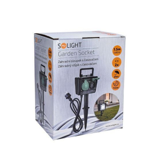 .Solight zahradní sloupek IP44, 2 zásuvky + časový spínač, gumový kabel 1,5m