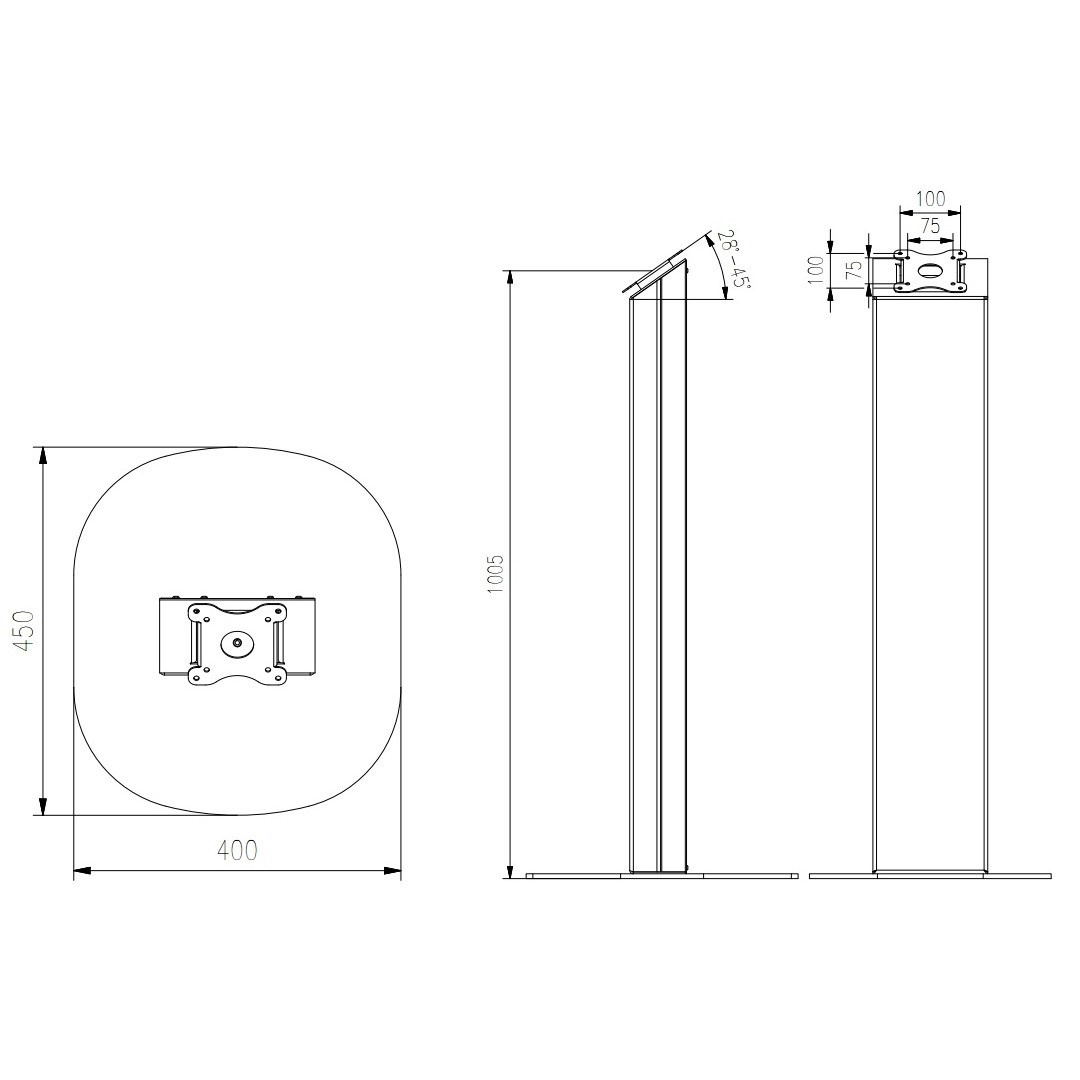 Stojan na televíziu alebo monitor EDBAK ITSV03 Profesionálny celokovový stojan na televízie a monitory 15-43", výška 105cm, nastaviteľný náklon 29-45°, skryté vedenie káblov, skvelá stabilita, VESA 75x75 a 100x100, nosnosť 8kg Profesionálny stojan na uchytenie televízií, monitorov a dotykových displejov s uhlopriečkou 15" až 43". Stojan podporuje VESA štandardy 75x75 a 100x100, výška 105cm, umožňuje reguláciu náklonu obrazovky od 29° do 44°. Konštrukcia je celokovová, liatinový podstavec s rozmermi 450x400mm poskytuje vynikajúcu stabilitu a bezpečnosť. V telese stojanu je priestor pre skryté vedenie všetkých káblov. Nosnosť 8kg. Stojan je krásneho dizajnu. Najvyššia kvalita a estetika stojanu ITSV03 uspokojí aj najnáročnejších zákazníkov. Záruka 10 rokov. Profesionálny stojan na dotykové displeje, monitory, tablety a EET pokladnice, celokovové prevedenie, vynikajúca bezpečnosť a stabilita, skryté vedenie káblov, krásny dizajn - EDBAK ITSV03 Technické údaje: maximálna bezpečná záťaž 8kg podporuje VESA štandardy 75x75 a 100x100 vhodný na klasické alebo dotykové monitory a TV s uhlopriečkou 15" až 43" výška stojanu 1050mm možnosť regulácie náklonu obrazovky od 29° do 44° systém pre skryté vedenie všetkých káblov telom stojanu liatinová podstava o rozmeroch 450x400mm, otvory na upevnenie profesionálna kvalita stabilný a bezpečný farebné prevedenie čierne matné záruka 10 rokov Stojan na TV monitory Edbak ITSV03 podporuje VESA štandardy: VESA 75x75 VESA 100x100 za príplatok VESA 200x100 a 100x200 za príplatok VESA 200x200