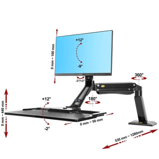 Stolný kancelársky držiak monitora a klávesnice NB FC40B Profesionálny stolný držiak pre uchytenie monitorov 17-35" vrátane police na klávesnicu s myšou. Plná polohovateľnosť, TOP kvalita Plne polohovateľný stolný držiak na monitor s policou na klávesnicu a myš - pracovná stanica s nastavením výšky, možnosť pracovať posediačky alebo v stoji. Držiak je ideálny na monitory s uhlopriečkou 17-35", ktoré majú hmotnosť v rozmedzí 2-15kg (držiak má plynové pištoľ s nastavením na hmotnosť monitora pre veľmi ľahké a rýchle polohovanie). Podpora VESA 75x75 a 100x100, možnosť rozšírenia na 200x100 a 200x200. Uchopenie na stolovú dosku o priemere 10-90mm, 2 typy stolových úchytov (na okraj stolu alebo do priestoru cez priechodku). Na držiaku sú integrované 2 USB porty 3.0 pre zapojenie klávesnice a myši alebo iného príslušenstva. Farebné prevedenie čierne, záruka 3 roky. Kancelársky stolný držiak na monitor a police na klávesnicu s myšou, plná polohovateľnosť Fiber Mounts FC40B Technické parametre: Na monitory 17" až 35" Minimálne zaťaženie držiaka 2 kg Maximálne zaťaženie držiaka 15 kg Nastavenie náklonu obrazovky +12°/-9° Otočné rameno o 180° Korekcia roviny monitora +3°/-3° Nastaviteľná vzdialenosť 530 ~ 1280 mm Rozmery police na klávesnicu 650 ~ 340 mm Výškové nastavenie v rozsahu 0 ~ 440 mm Regulácia nastavenia sklonu klávesnice -2°/+12° 2x USB port 3.0 Podpora VESA štandardu Systém vedenia káblov Sklápacia polica na klávesnicu Jednoduchá manipulácia Kvalitné spracovanie Jednoduchá montáž Hliníková zliatina Farebné prevedenie čierne Záruka 3 roky Kompatibilné so štandardmi VESA (rozteč montážnych otvorov): VESA 75x75 VESA 100x100 možnosť rozšírenia na 100x200 a 200x100 možnosť rozšírenia na 200x200 Pracovná stanica FC40B - stolný držiak na monitor s policou na klávesnicu a myš, ktorý je plne polohovateľný. TOP kvalita, jednoduché nastavenie, krásny dizajn.