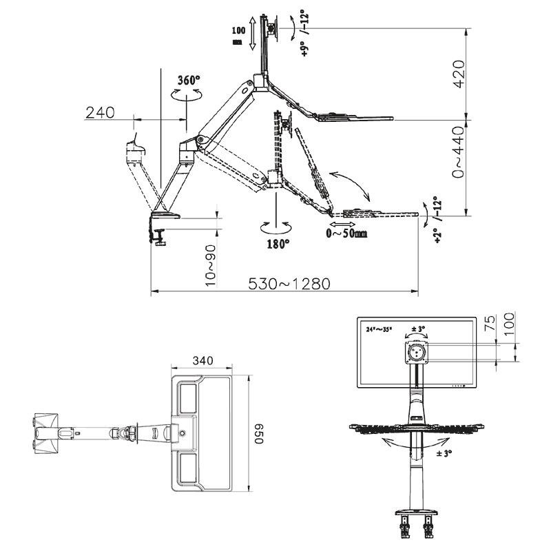Stolný kancelársky držiak monitora a klávesnice NB FC40B Profesionálny stolný držiak pre uchytenie monitorov 17-35" vrátane police na klávesnicu s myšou. Plná polohovateľnosť, TOP kvalita Plne polohovateľný stolný držiak na monitor s policou na klávesnicu a myš - pracovná stanica s nastavením výšky, možnosť pracovať posediačky alebo v stoji. Držiak je ideálny na monitory s uhlopriečkou 17-35", ktoré majú hmotnosť v rozmedzí 2-15kg (držiak má plynové pištoľ s nastavením na hmotnosť monitora pre veľmi ľahké a rýchle polohovanie). Podpora VESA 75x75 a 100x100, možnosť rozšírenia na 200x100 a 200x200. Uchopenie na stolovú dosku o priemere 10-90mm, 2 typy stolových úchytov (na okraj stolu alebo do priestoru cez priechodku). Na držiaku sú integrované 2 USB porty 3.0 pre zapojenie klávesnice a myši alebo iného príslušenstva. Farebné prevedenie čierne, záruka 3 roky. Kancelársky stolný držiak na monitor a police na klávesnicu s myšou, plná polohovateľnosť Fiber Mounts FC40B Technické parametre: Na monitory 17" až 35" Minimálne zaťaženie držiaka 2 kg Maximálne zaťaženie držiaka 15 kg Nastavenie náklonu obrazovky +12°/-9° Otočné rameno o 180° Korekcia roviny monitora +3°/-3° Nastaviteľná vzdialenosť 530 ~ 1280 mm Rozmery police na klávesnicu 650 ~ 340 mm Výškové nastavenie v rozsahu 0 ~ 440 mm Regulácia nastavenia sklonu klávesnice -2°/+12° 2x USB port 3.0 Podpora VESA štandardu Systém vedenia káblov Sklápacia polica na klávesnicu Jednoduchá manipulácia Kvalitné spracovanie Jednoduchá montáž Hliníková zliatina Farebné prevedenie čierne Záruka 3 roky Kompatibilné so štandardmi VESA (rozteč montážnych otvorov): VESA 75x75 VESA 100x100 možnosť rozšírenia na 100x200 a 200x100 možnosť rozšírenia na 200x200 Pracovná stanica FC40B - stolný držiak na monitor s policou na klávesnicu a myš, ktorý je plne polohovateľný. TOP kvalita, jednoduché nastavenie, krásny dizajn.