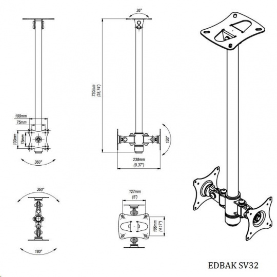 Stropný držiak TV monitoru EDBAK SV32 Profesionálny stropný držiak na zavesenie 2 televízorov alebo monitorov 17-37" za sebou, výškové nastavovanie, otáčanie, náklon, funkcia PIVOT Stropný držiak najvyššej kvality na zavesenie 2 obrazoviek s uhlopriečkou 17-37". Držiak umožňuje kompletnú nastaviteľnosť - reguláciu výšky, otáčanie jednotlivých obrazoviek na stranách, náklon a rotáciu - funkcia PIVOT. Konštrukcia je oceľová, hrubostenná. Držiak podporuje VESA štandardy 75x75 a 100x100, je možné zakúpiť rozšírenie na 200x100 a 200x200. Kabeláž je možné viesť vo vnútri držiaku. Vybrať si môžete vo 2 farebných variantoch - čierne a strieborné. Záruka 10 rokov. Stropný držiak na nezávislé zavesenie 2 obrazoviek chrbtom k sebe - Edbak SV32 Technické údaje: maximálne zaťaženie 20kg odporúčaná uhlopriečka TV alebo monitoru 17" až 37" podporuje VESA štandardy 75x75 a 100x100 za príplatok možnosť rozšírenia VESA štandardu na 200x100 alebo 200x200 dĺžka držiaku 730mm nastavenie vzdialenosti od stropu nezávislé otáčanie obrazoviek na obe strany +/- 90° náklon obrazovky nahor alebo nadol +/- 60° funkcia PIVOT - horizontálne alebo vertikálne natočenie obrazovky profesionálny stropný držiak na 2 obrazovky materiál oceľ farebné prevedenie čierne alebo strieborné záruka 10 rokov Držiak podporuje VESA štandardy: VESA 75x75 VESA 100x100 VESA 200x100 - za príplatok VESA 200x200 - za príplatok