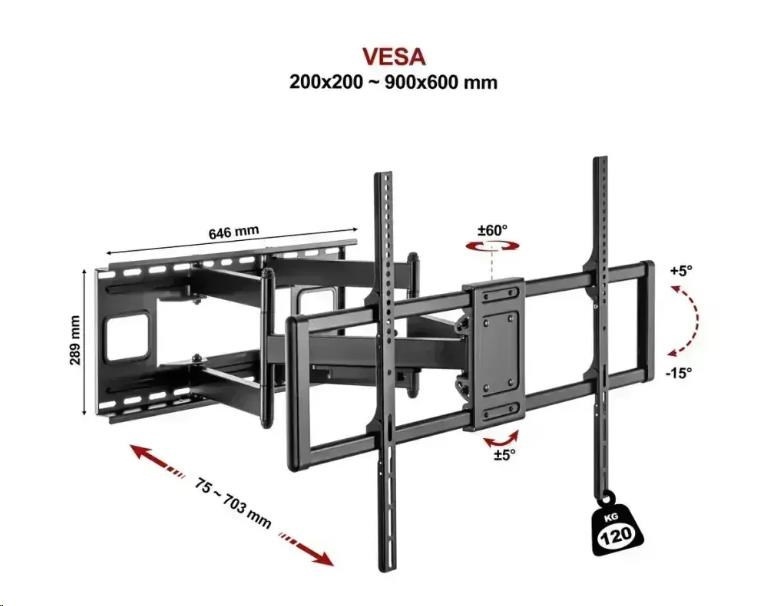 Super pevný TV držiak Fiber Novelty MEGA120 Držiak na TV 55" - 120", otočný +60° / -60°, sklopný +5° / -15°, vzdialenosť od steny 75 - 703mm, korekcia roviny +5° / -5°, inštalačný materiál, šablóna aj minivodováha, VESA štandardy 200x200 až 900x600, nosnosť 120kg Predstavujeme Fiber Novelty MEGA120, revolučný držiak na televízie, ktorý prináša neuveriteľnú flexibilitu a bezpečnosť pre vašu domácu zábavu. S možnosťou inštalácie televízorov od 55" až do neuveriteľných 120", tento držiak je navrhnutý tak, aby vyhovoval širokej škále potrieb a preferencií. Jeho robustná konštrukcia zabezpečuje, že váš televízor bude v bezpečí a stabilný, zatiaľ čo unikátny otočný a sklopný mechanizmus ponúka široké možnosti pre nastavenie optimálneho pozorovacieho uhla. MEGA120 držiak na televízie s nosnosťou 120kg a VESA 200x200 až 900x600 Fiber Novelty MEGA120 je vyrobený s ohľadom na najvyššie štandardy kvality a starostlivo vybraný inštalačný materiál zabezpečuje jednoduchú a rýchlu inštaláciu. Vďaka širokému rozsahu VESA kompatibility od 200x200 po 900x600 je tento držiak ideálnou voľbou pre takmer každý televízor na trhu. Navyše s nosnosťou až 120kg môžete byť istí, že váš televízor je v bezpečí. Využite plný potenciál svojho televízora s Fiber Novelty MEGA120 a premeňte svoj obývač na ultimátne centrum domácej zábavy. Či už sledujete svoj obľúbený film, deti si užívajú kreslené, alebo hostíte športový večer s priateľmi, tento držiak sa postará o nezabudnuteľný zážitok pre všetkých. Profesionálny extrémne pevný držiak na veľké televízie MEGA120 Technické údaje: nosnosť 120 kg na televízie, monitory a displeje s uhlopriečkou 55" - 120" podporované VESA štandardy 200x200 až 900x600 nastavenie vzdialenosti od steny 75 - 703mm otočenie do strán až +60° / -60° naklonenie obrazovky +5° / -15° korekcia roviny +5° / -5° výnimočne pevná konštrukcia úchytky na káble inštalačný materiál a šablóna, minivodováha hmotnosť samotného držiaka (bez TV) cca. 15kg farebné prevedenie čierne záruka 3 roky Nastaviteľná vzdialenosť od steny od 75 do 703 mm na držiaku TV MEGA120 Držiak TV MEGA120 podporuje tieto VESA štandardy: VESA 200x200 VESA 300x200 a 200x300 VESA 300x300 VESA 400x200 a 200x400 VESA 400x300 a 300x400 VESA 400x400 VESA 600x400 a 400x600 VESA 600x600 VESA 800x400 VESA 800x600 VESA 900x500 VESA 900x600