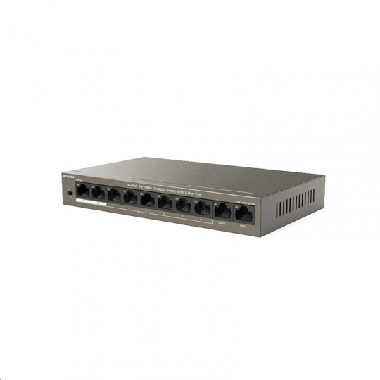 Tenda TEF1110P-8-63W prepína dáta pomocou 10 portov RJ45, 8 portov 10/100 Mbps podporuje PoE802.3af/at + 2 porty 10/100 Mbps pre Uplink. Spínač má ochranu proti prepätiu 6 kV. Podpora prepínania uzlov typu Store-and-Forward. Plne duplexné riadenie toku 802.3x, poloduplexné riadenie toku v režime Back-Pressure. Dva porty Uplink možno použiť na pripojenie prepínača k sieti a druhý na pripojenie iného zariadenia bez PoE, napr. NVR a ďalšie.