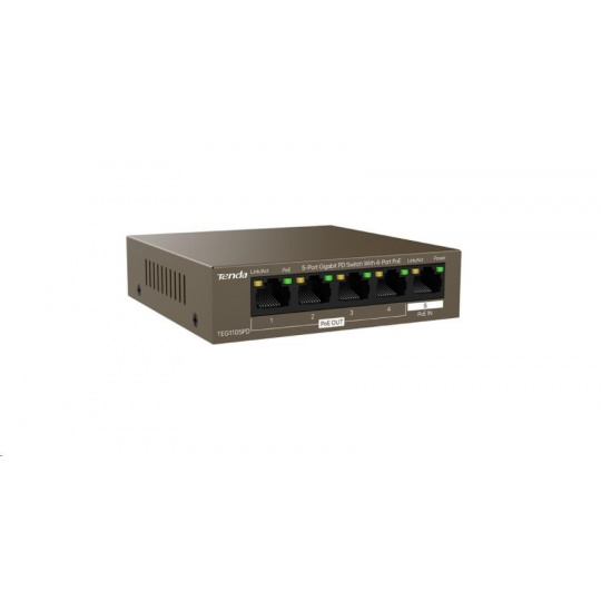 Tenda TEG1105PD - 5-portový PoE PD Gigabit Ethernet Switch, 1x PoE IN, 4x PoE OUT, kovový, bez ventilátora