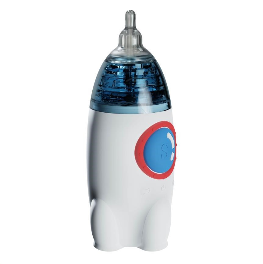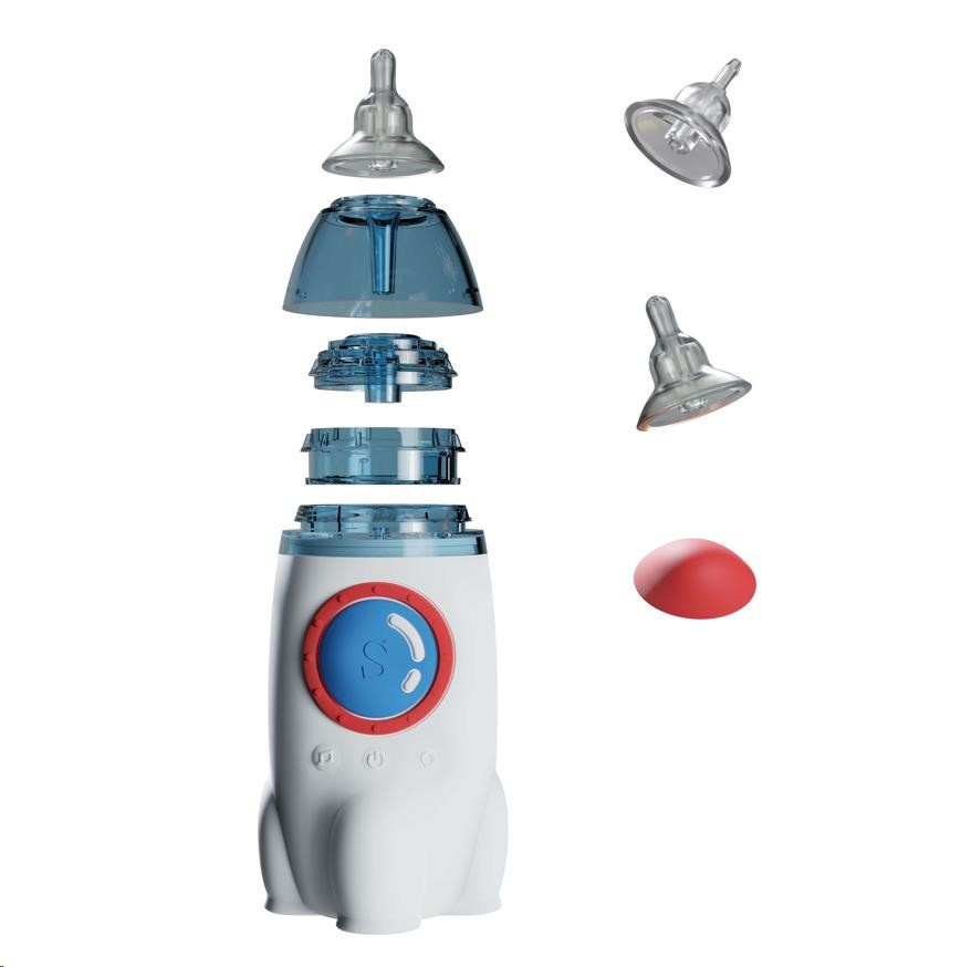 Hoci je odsávanie s TESLA Nasal Aspirator NA300 jemné a bezpečné, bude zrejme aj tak potrebné dieťa rozptýliť. Pozornosť pritiahne farebné svetlo prenikajúce cez modrý prstenec prístroja alebo desať melódií. Zaujme však aj svojím dizajnom. Vyzerá ako vesmírna raketa, a tak ju ani nemusíte po každom použití schovať späť do lekárničky. Ak zostane na policí vedľa postieľky, stane sa atraktívnym doplnkom detskej izbičky.