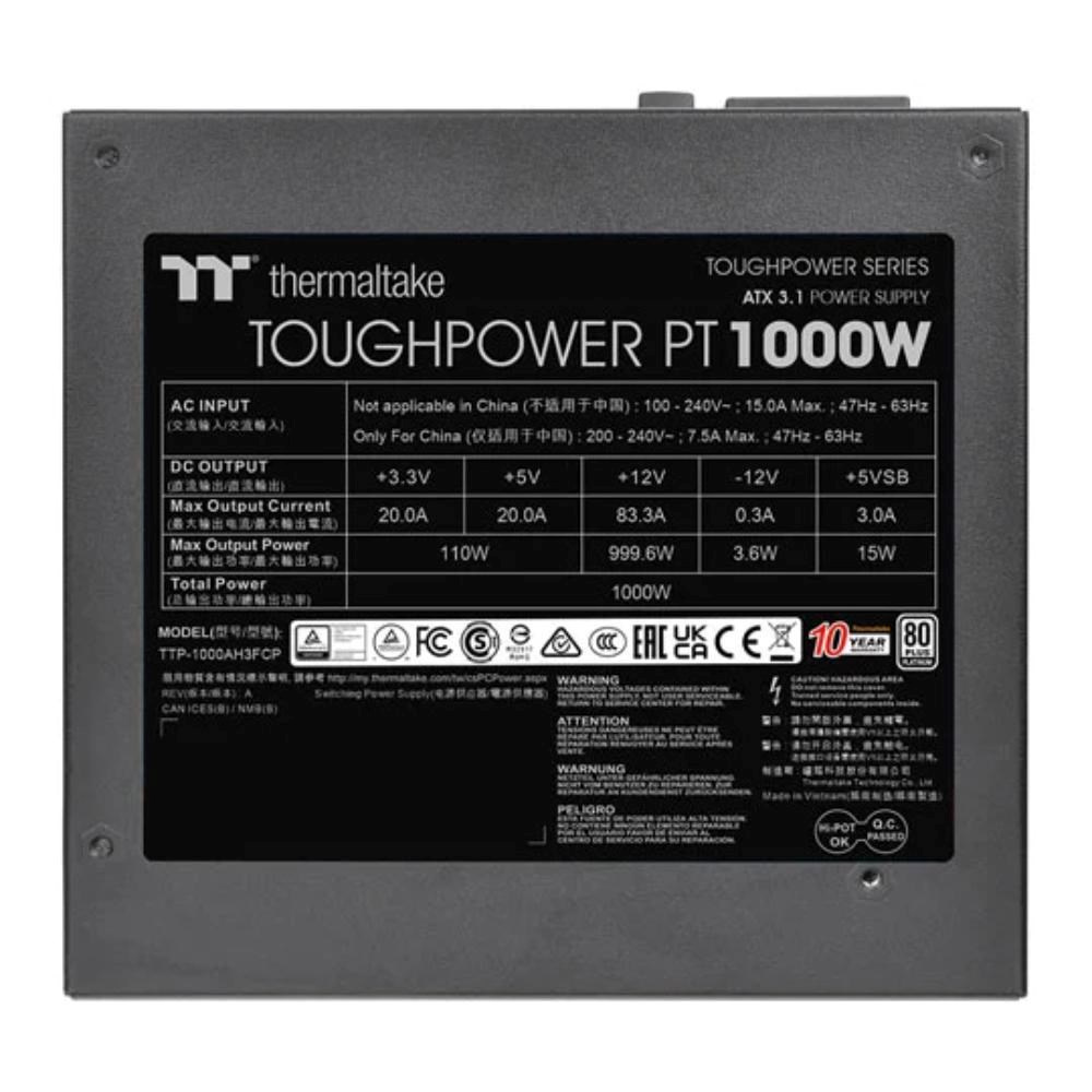 Toughpower PT 1000W Platinum je kompatibilný s ATX 3.1, má certifikáciu 80 PLUS Platinum a podporuje nativné PCIe Gen 5.1 (12+4pin) pre napájanie novej generácie grafických kariet. Poskytuje 1000 W nepretržitého výkonu pri 40 °C.