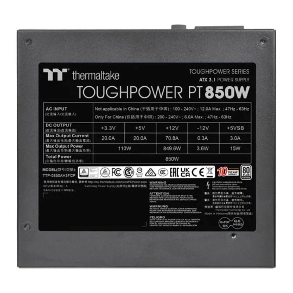 Toughpower PT 850W Platinum je kompatibilný s ATX 3.1, má certifikáciu 80 PLUS Platinum a podporuje nativné PCIe Gen 5.1 (12+4pin) pre napájanie novej generácie grafických kariet. Poskytuje 850 W nepretržitého výkonu pri 40 °C.