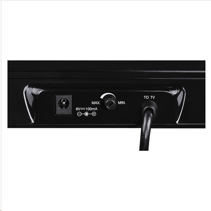 - štýlová anténa na príjem digitálneho televízneho (DVB-T/DVB-T2) aj rozhlasového (DAB/DAB+) vysielania - integrovaný zosilňovač s reguláciou - decentná modrá prevádzkova kontrolka integrovaná do priehľadného pruhu - pevne pripojený anténny kábel (dĺžka 1,5 m) - napájanie cez sieťový adaptér (súčasť balenia, dĺžka kábla 1,8 m) alebo z prijímača po anténnom kábli (5 V) - sieťový vypínač na kábli adaptéra pre úsporu energie - frekvenčný rozsah: 174-230 MHz / 470-790 MHz - kategória: Performance 45* (orientačný dosah 25 km) - rozmery: 26 x 13,5 x 7,5 cm - farba: lesklá čierna *Informácie: Nová smernica 2014/53/EÚ, známa ako "RED", sa zaoberá uvoľnením pôvodného televízneho vysielacieho pásma v prospech sietí mobilnej komunikácie. Okrem iného tiež obmedzuje u aktívnych antén (nové na trhu) uvádzané zosilnenie v decibeloch dB. Maximálna povolená hodnota je 20 dB (dBi), pretože vyššie hodnoty nie sú reálne využiteľné a sú zavádzajúce. Preto Hama rozdeľuje nové antény do kategórií "Performance xy", kde xy je číslo, vyjadrujúce príjmové schopnosti a vybavenie/funkcie antény (vyššie číslo = lepšia anténa). Pre lepšiu orientáciu sú čísla zvolené tak, aby aspoň približne zodpovedali pôvodne uvádzanému zosilneniu v dB.