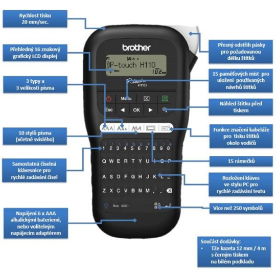 Tlačiareň štítkov BROTHER PT-H110 - 12 mm, TZe pásky - marker