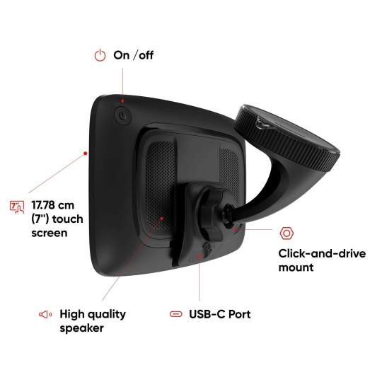 Na 7" dotykovej obrazovke si môžete prezrieť svoju trasu vo vysokých detailoch. A vďaka ovládaniu pomocou hlasových príkazov môžete zariadenie GO Camper Max ovládať, bez toho aby ste museli zložiť ruky z volantu. Ľahko použiteľný držiak Click-and-Drive navyše drží navigačné zariadenie bezpečne na mieste.