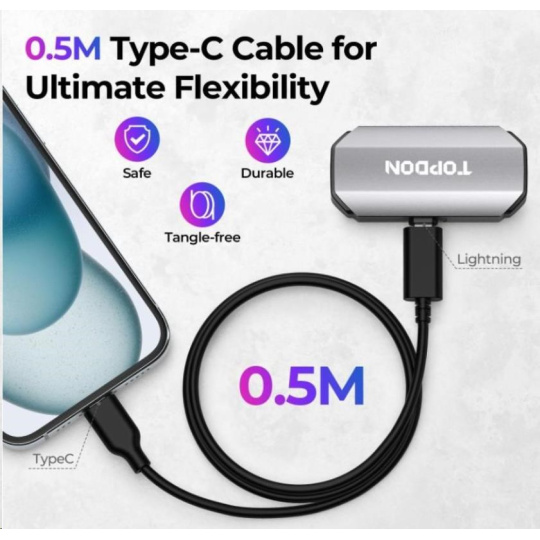 Kábel TOPDON je vybavený adaptérom na pripojenie zariadenia s koncovkou Lightning na USB-C. Umožní vám ľahko prepojiť TC002 s iPhonom alebo iPadom, ktoré majú rozhranie Type-C.