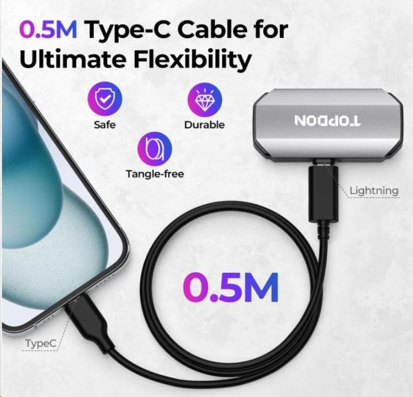 Kábel TOPDON je vybavený adaptérom na pripojenie zariadenia s koncovkou Lightning na USB-C. Umožní vám ľahko prepojiť TC002 s iPhonom alebo iPadom, ktoré majú rozhranie Type-C.