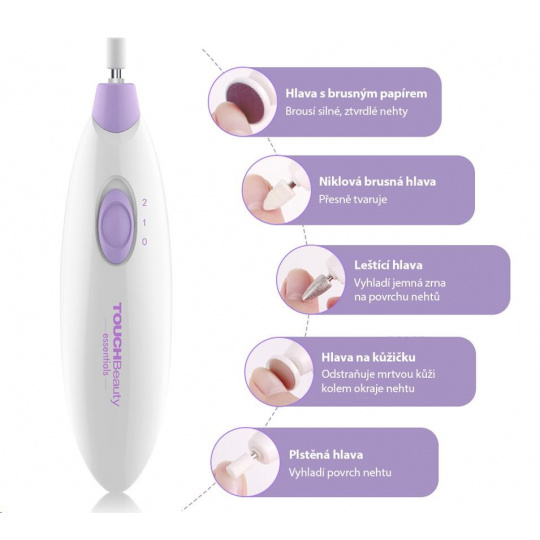 Sada na manikúru a pedikúru TOUCHBeauty 1039 je vhodná pre tvarovanie, opravy, brúsenie, leštenie a vyhladzovanie nechtov. Ponúka dokonca 5 rôznych nástavcov, 2 rôzne pracovné rýchlosti, a cestovné púzdro na prístroj a nástavce. Je vhodná pre starostlivosť o prírodné i umelé nechty, vyhladzuje hrubú kožu a odstraňuje mozole.