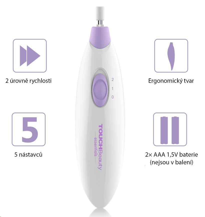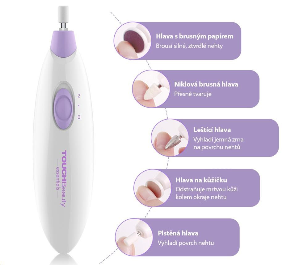 - Súprava s 5 nástavcami - čistí, opravuje, tvaruje, ostrie, brúsia, leštia nechty, odstraňuje mozole.