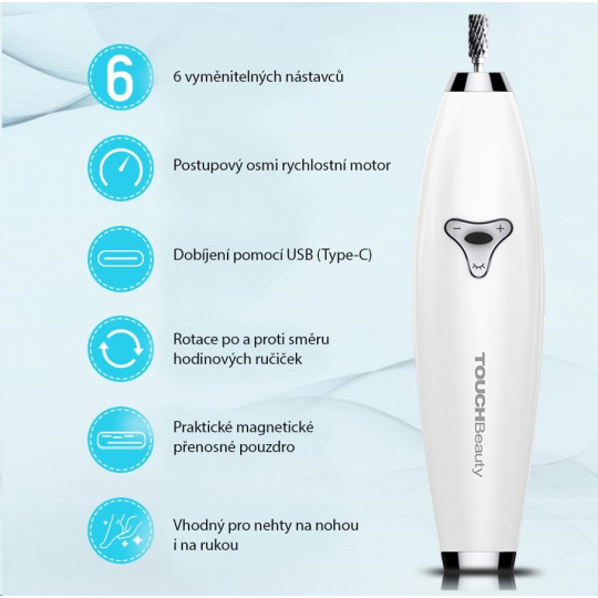 - Súprava sa 6 nadstavcami - čistí, opravuje, tvaruje, ostrí, brúsi a leští nechty.