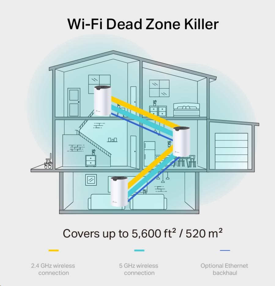 | WiFi Dosah | 3-5 Izbových domov (3-kus) TP-Link Mesh technológia Voliteľná ethernetová spätná väzba spolupracuje na prepojení jednotiek Deco na zabezpečenie plynulého pokrytia 3× antény (vnútorné) Viaceré antény tvoria signalizačnú škálu na pokrytie viacerých smerov a veľkého územia Beamforming Sústreďuje bezdrôtový signál smerom k klientom na rozšírenie WiFi dosahu |