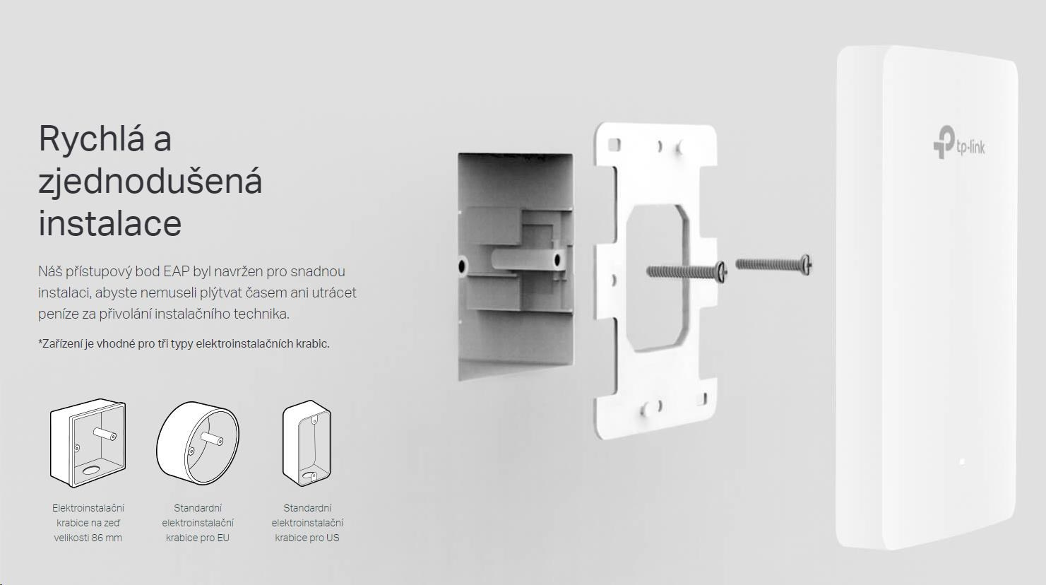 | Obsah balenia | • AX1800 Wall Plate WiFi 6 Access Point EAP615-Wall • Inštalačný návod • Montážne súpravy |