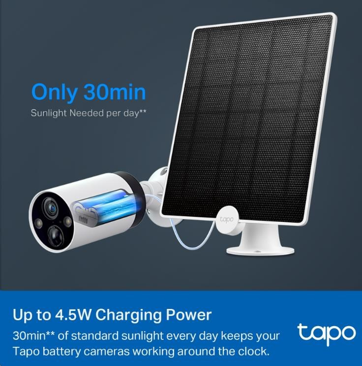 - Non-Stop Solar Power-Zachytáva bezplatnú, čistú slnečnú energiu a poskytuje nepretržité napájanie pre vaše kamery Tapo napájané batériami (Tapo C425, Tapo C420), aby vás chránili po celý rok.