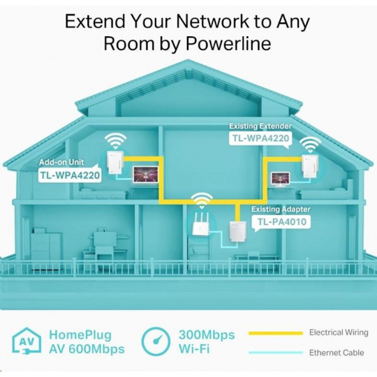 TL-WPA4220 pretvorí vašu existujúcu elektrickú sieť na vysokorýchlostnú internetovú sieť bez nutnosti ďalších káblov či vŕtania. Rozširujúca jednotka TL-WPA4220 podporuje sofistikovaný štandard HomePlug AV2 a je ideálnym riešením pre rozšírenie existujúcej siete vedené prostredníctvom elektrických rozvodov. Poskytuje spoľahlivý a vysokorýchlostný prenos dát až 600 Mbit/s cez vedenie dlhé až 300 metrov a zároveň prepája káblovú a bezdrôtovú sieť všade tam, kde je dostupná elektrická zásuvka.
