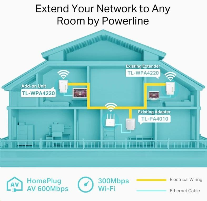 TL-WPA4220 pretvorí vašu existujúcu elektrickú sieť na vysokorýchlostnú internetovú sieť bez nutnosti ďalších káblov či vŕtania. Rozširujúca jednotka TL-WPA4220 podporuje sofistikovaný štandard HomePlug AV2 a je ideálnym riešením pre rozšírenie existujúcej siete vedené prostredníctvom elektrických rozvodov. Poskytuje spoľahlivý a vysokorýchlostný prenos dát až 600 Mbit/s cez vedenie dlhé až 300 metrov a zároveň prepája káblovú a bezdrôtovú sieť všade tam, kde je dostupná elektrická zásuvka.