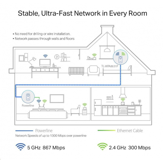 - Dvoupásmová sieť Wi-Fi AC1200 – zariadenie rozšíri ultra rýchlu dvoupásmovú Wi-Fi sieť s rýchlosťou až 867 Mbit/s v pásme 5 GHz a až 300 Mbit/s v pásme 2,4 GHz.