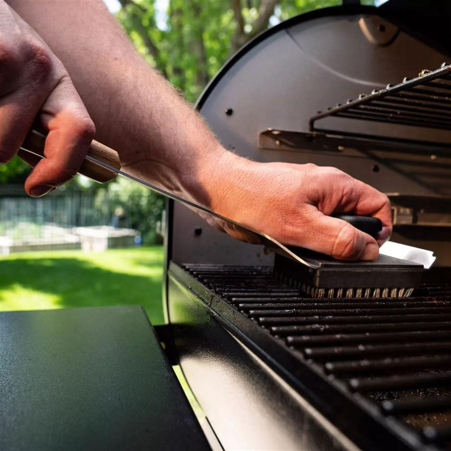 Predstavujeme bezpečnejší spôsob čistenia vychladených roštov grilu. Naše čistiace kefy Traeger BBQ majú nylonové štetiny, ktoré nepoškodia rošty ani sa nedostanú do hamburgerov.